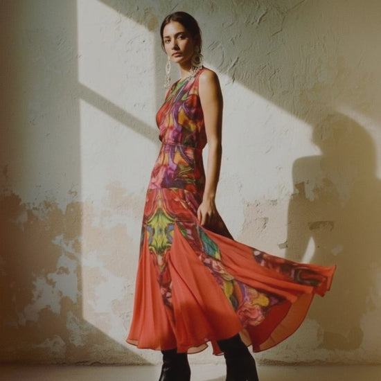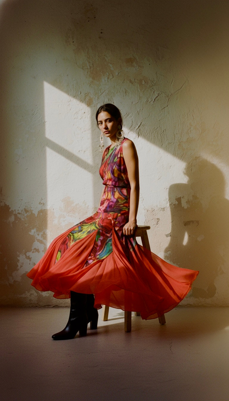 Falda larga de silueta fluida que celebra el movimiento y el color como expresión. Su diseño combina una estampa exclusiva de inspiración pictórica con paños de color pleno que aportan profundidad y ritmo visual.