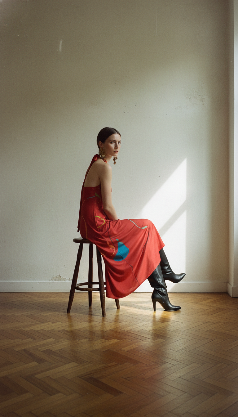 Óleo Flow es un vestido midi de silueta fluida con escote halter y una estampa exclusiva inspirada en trazos orgánicos y capas de color. Su caída suave acompaña el movimiento con ligereza, ofreciendo comodidad y elegancia en una sola pieza.